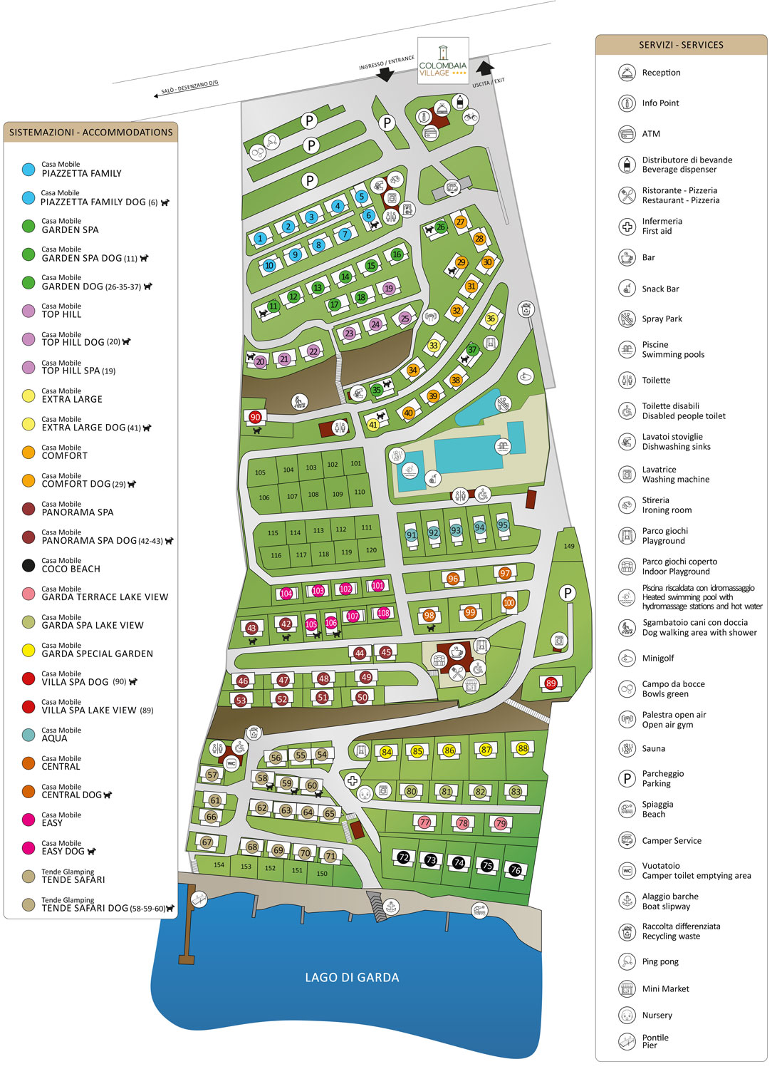 Sieh dir den Lageplan des Campingplatzes Colombaia an, um zu erfahren, wo sich die Unterkünfte befinden.