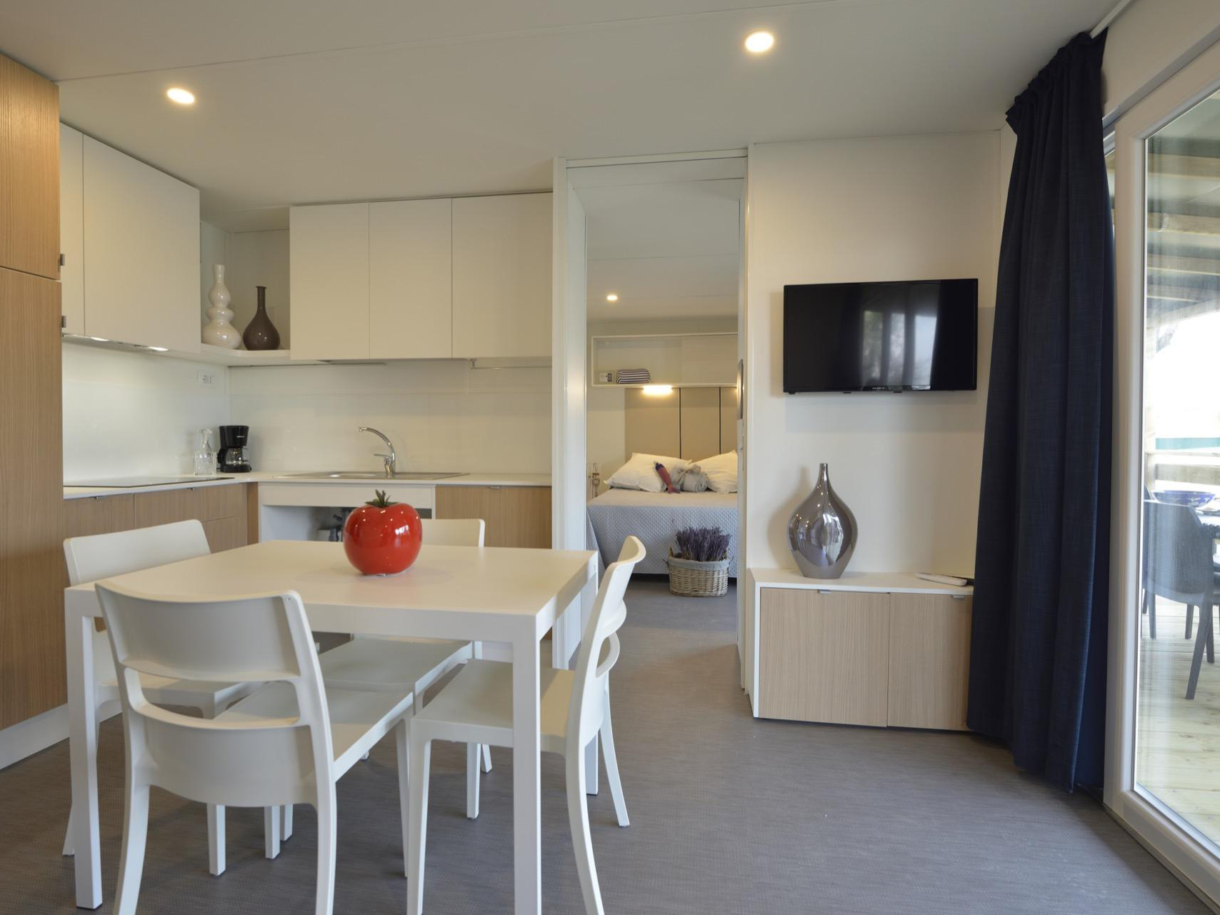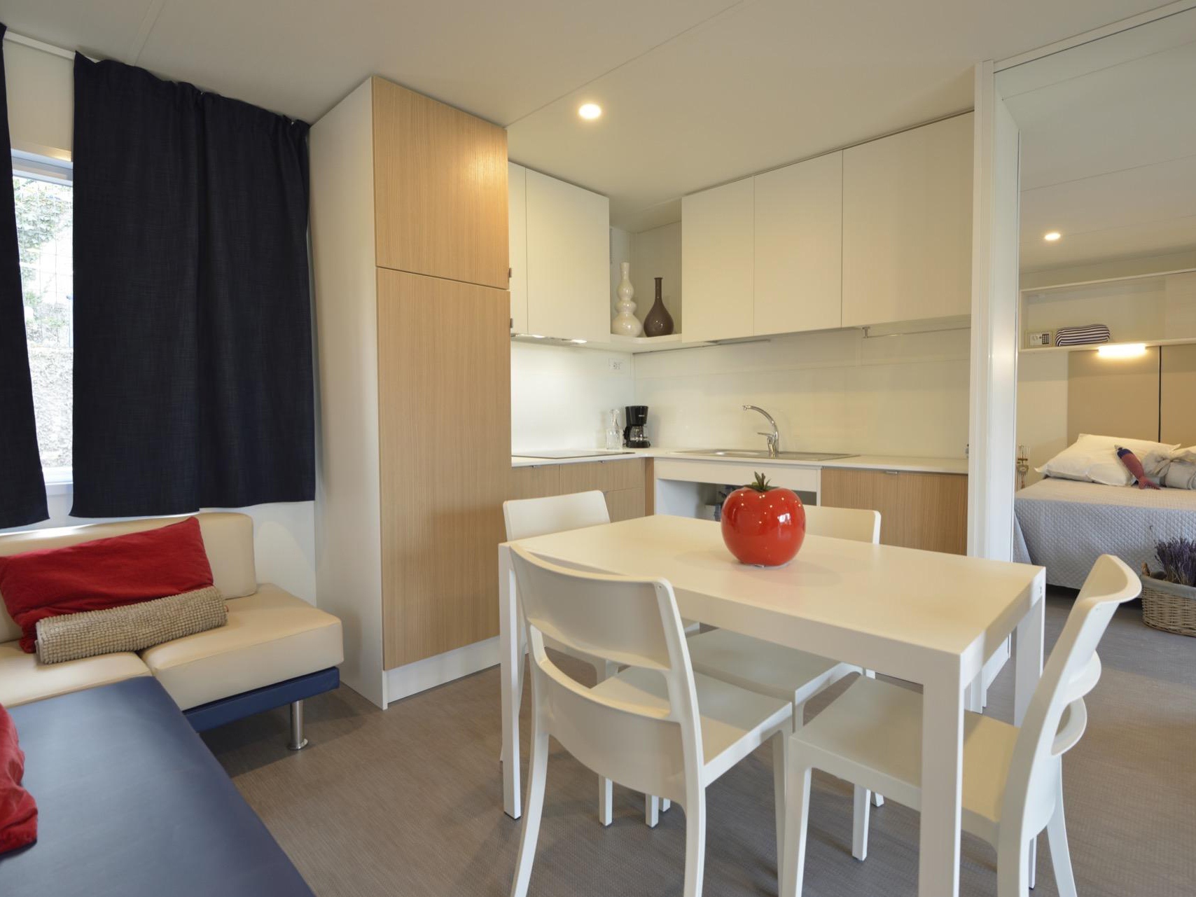 Das Mobilheim EXTRA LARGE mit einer Fläche von 44 m² bietet eine geräumige, funktionelle und komfortable Unterkunft. Die Unterkunft verfügt über ein Wohnzimmer mit Klimaanlage, eine Küchenzeile mit Induktionskochfeld und Sofa, 1 Schlafzimmer mit Doppelbett, 1 Schlafzimmer mit 3 Einzelbetten (eines davon ist ein Hochbett) und 2 Badezimmer mit WC, Dusche und Waschbecken. Überdachte Außenveranda (8 x 2,5 m) mit Tor. Ein Parkplatz inbegriffen. Das Haus kann 5 +1 Personen beherbergen (6. Person auf Anfrage und gegen Bezahlung). Ein Parkplatz ist inbegriffen. Haustiere NICHT erlaubt.