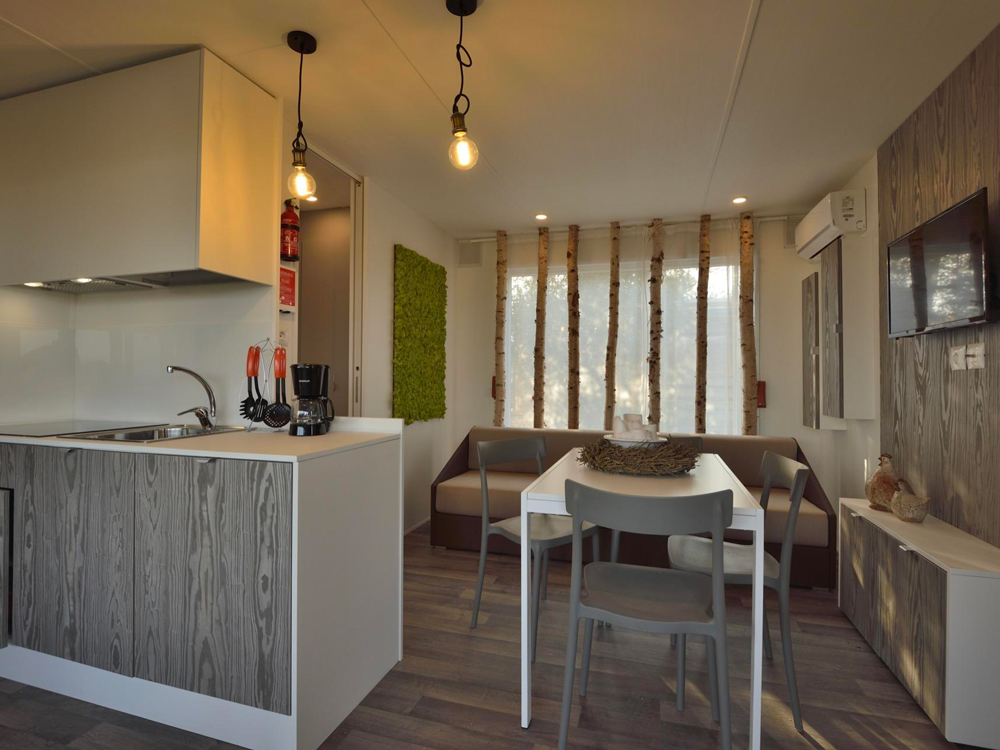 La casa mobile TOP HILL DOG può ospitare fino a 5 persone. La casa mobile, con una superficie di 37 mq, offre spazi funzionali e confortevoli; la sistemazione dispone di soggiorno con aria condizionata, angolo cottura con piano a induzione e divano, 1 camere da letto matrimoniale, 1 camera da letto con 3 letti singoli (di cui uno a bandiera) e 2 bagni con Wc, doccia e lavabo. All’esterno veranda coperta con vista lago (8 x 2,5 m). Un posto auto incluso. Massimo 2 animali domestici ammessi.
